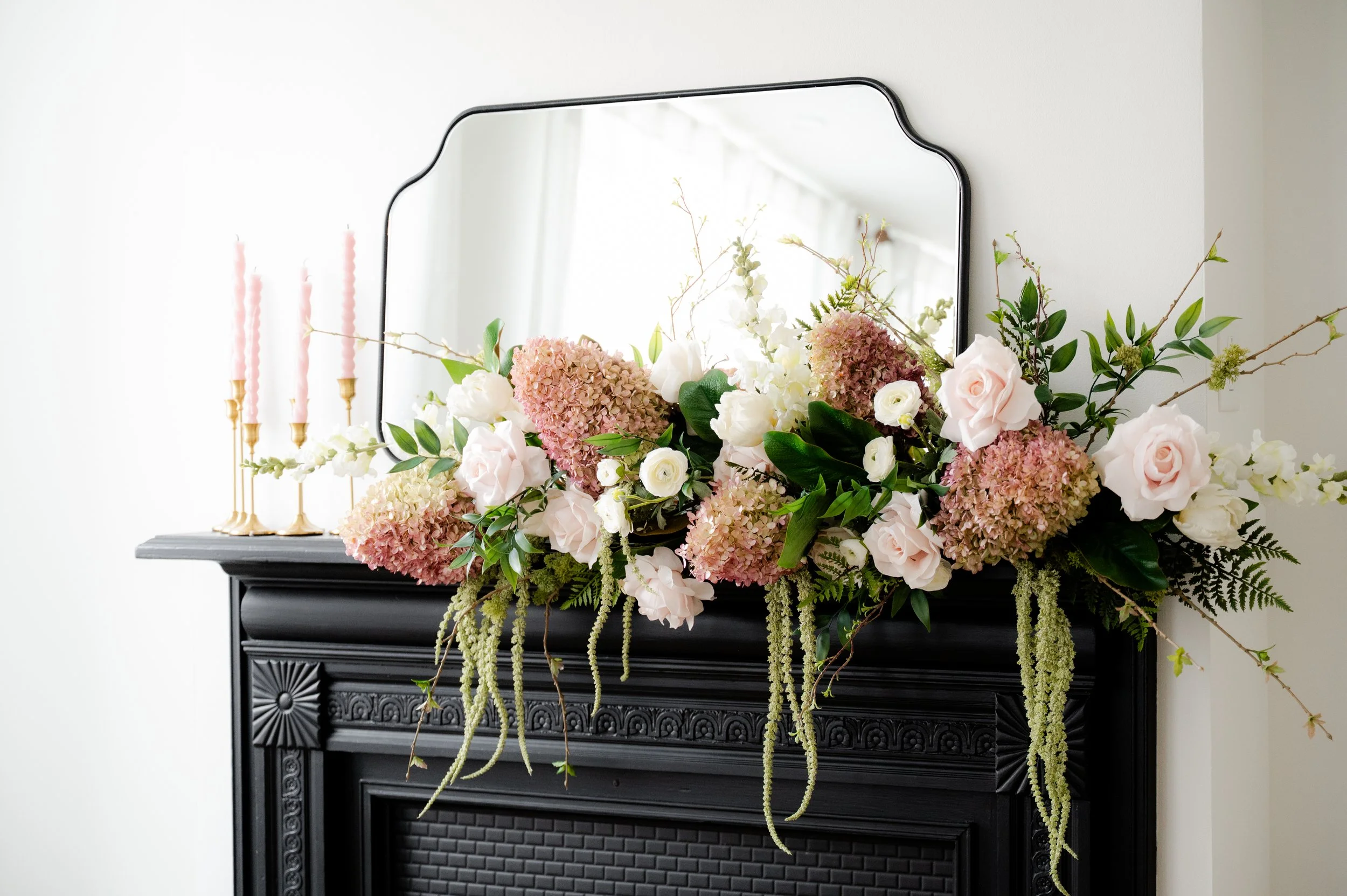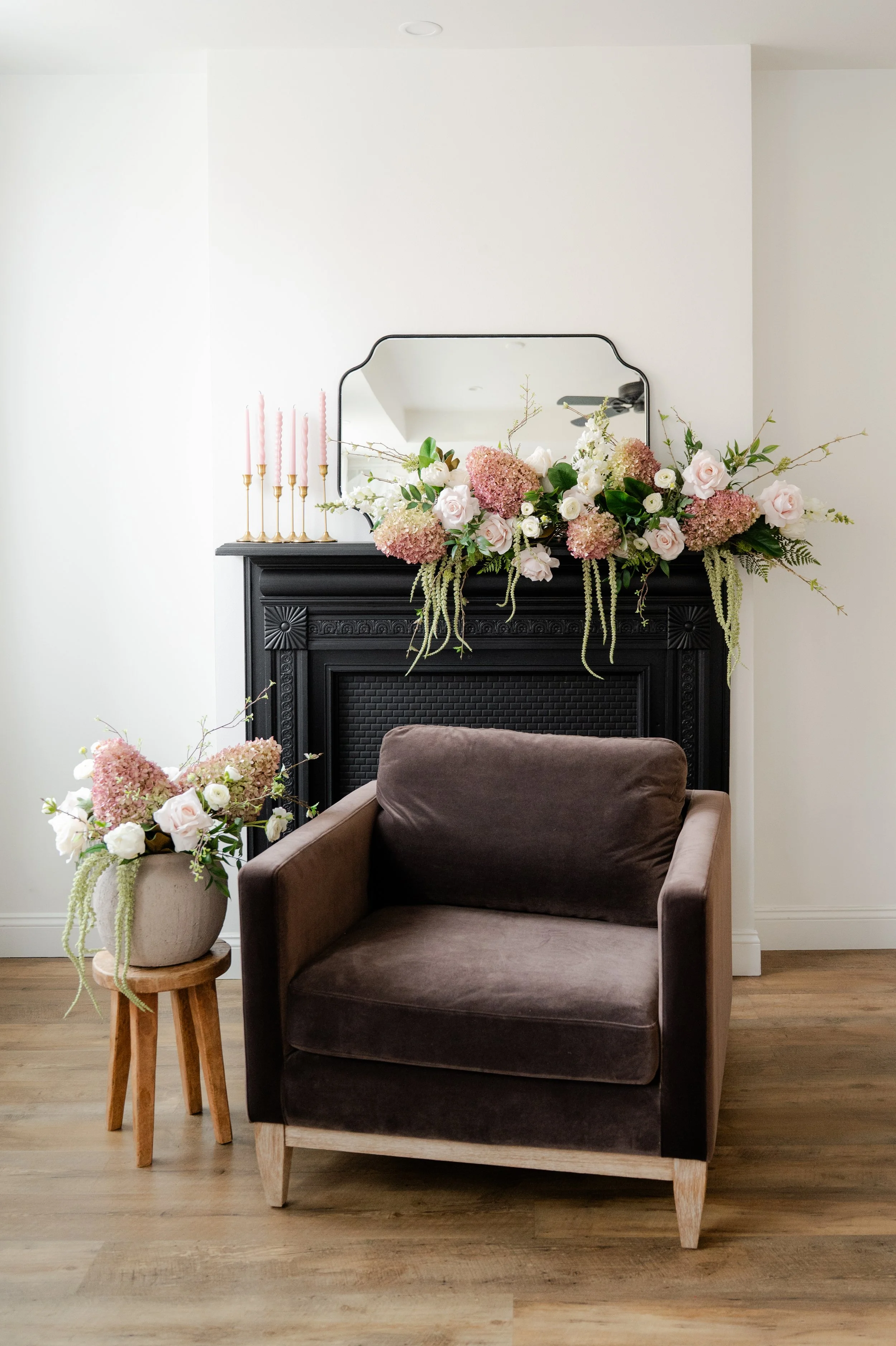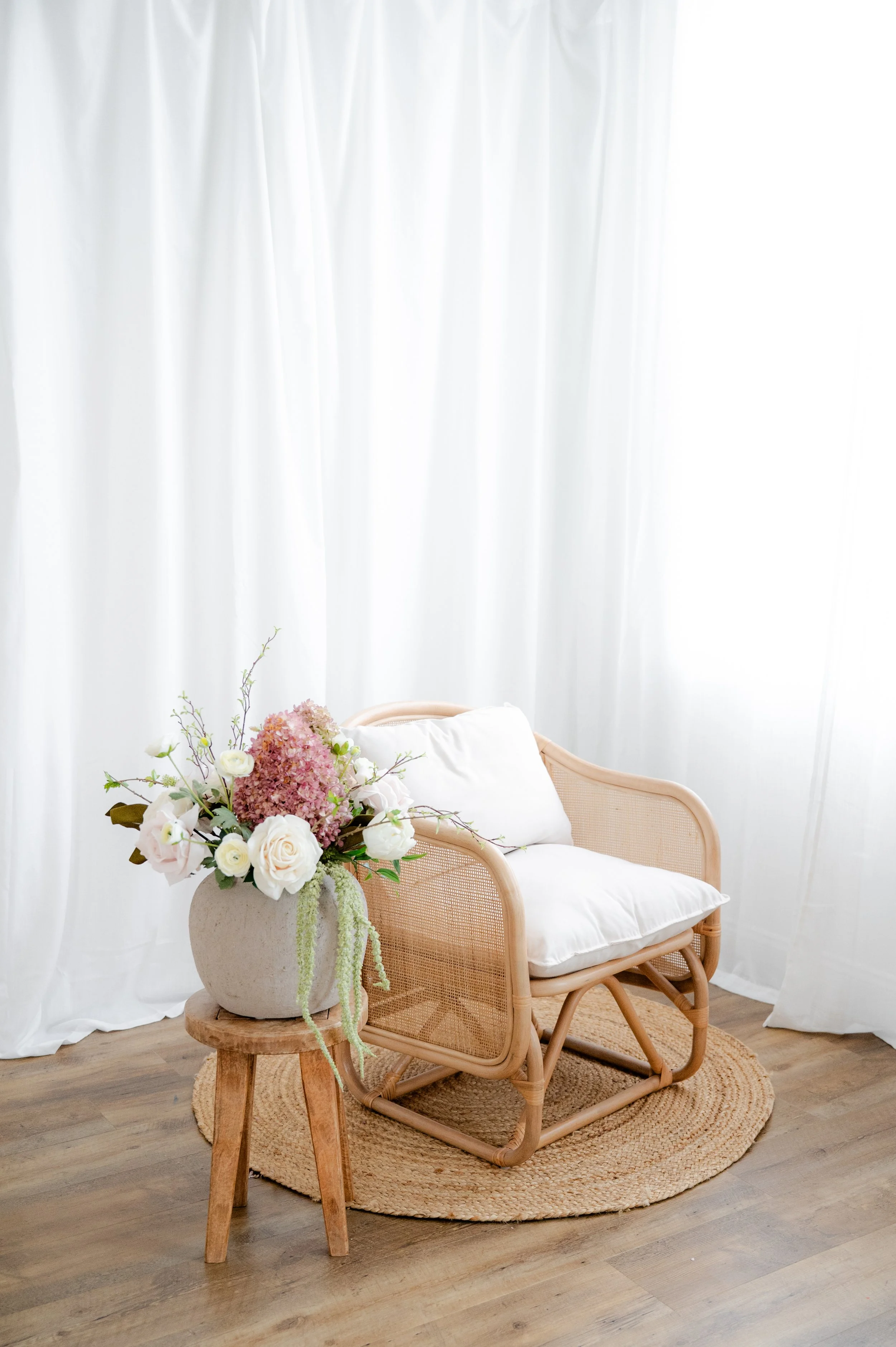 This year’s space features layered blush hydrangeas, romantic florals, natural wood textures, and soft neutral styling.